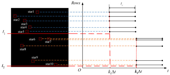 Rolling shutter exposure mode is an exposure mode in which the CMOS image sensor performs line-by-line exposure with a delay between lines [20]. When the star sensor is working in the orbit, the position of the navigation star point in the imaging star map is shifted [21] and the shape is distorted due to the relative speed between the navigation star point and the satellite platform, as shown in Figure 2. If we define the number of coordinate rows of the i-th star point as , and the corresponding delay time from the first line as , this distortion will seriously affect the star sensor’s star point positioning accuracy and attitude measurement accuracy.