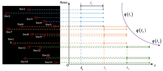 In order to obtain the true optimal posture at time , the star point information at the time calculated from is added to the matrix at time . However, the rolling shutter exposure causes the exposure time of each star point to be different. Thus, according to the distribution of the star points in the star map, the star points in the time period need to be corrected. Therefore, the star points exposed in the time period are all corrected to the time using the start point correction method, and the measurement information at the time is obtained to form . The attitude information of the star sensor at is determined by combining the recursive matrix and the matrix constructed by the corrected measurement vector information.