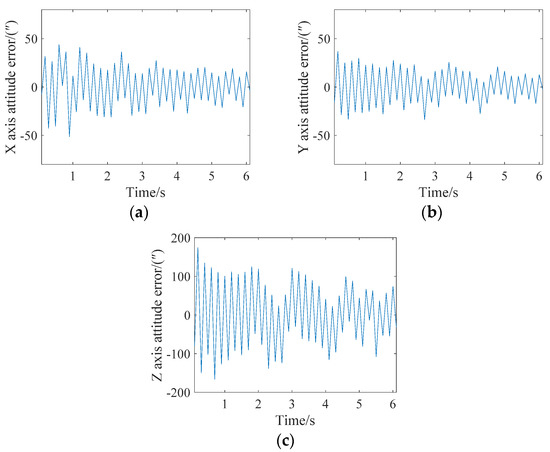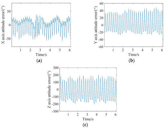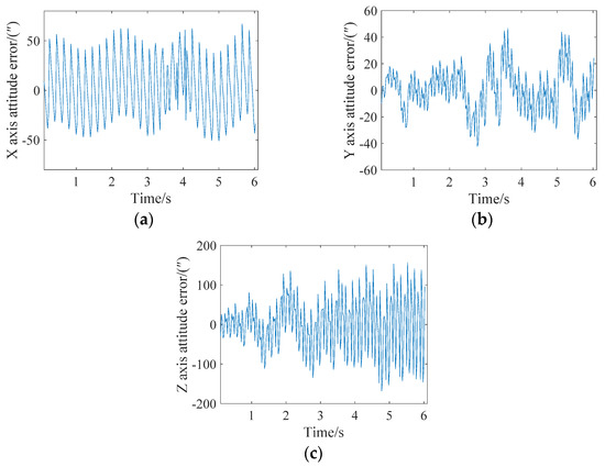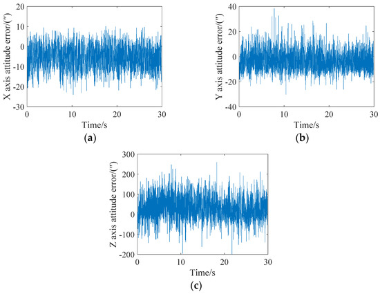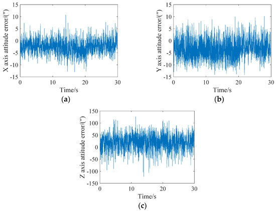 In extreme cases, an attitude update can be completed for every star point. The attitude angle error analysis of the X, Y and Z axes is shown in Figure 10. It can be seen from the figure that the maximum errors of the X, Y and Z axes is less than 15″, 30″ and 200″, respectively. A single frame of the star map can achieve 15 attitude updates.