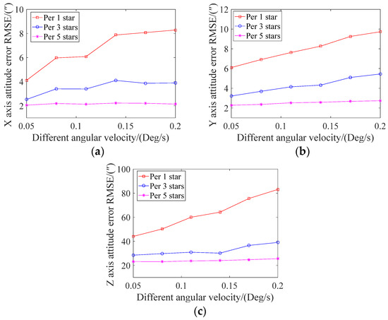 The attitude error under different angular velocities is shown in Figure 11. It can be seen from the figure that the X, Y, and Z axes’ errors for each star point and all three updates of the attitude increased with the increase in angular velocity. Moreover, the attitude error was relatively stable when the attitude was updated once every five star points. At 0.2 degrees/s, the X and Y axes’ attitude angle errors were all within 10″ in all three cases, while the Z-axis had a relatively large error. When each star point was updated, the error exceeded 80″.