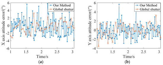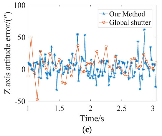 Figure 12 compares the attitude errors of rolling shutter exposure with every five stars being corrected and global shutter exposure using 15 stars to calculate the attitude. It can be seen from the figure that the attitude accuracy of the global exposure on the X, Y, and Z axes is slightly higher than that of the rolling shutter exposure after correction, mainly because there are 15 star points involved in the calculation of each frame of the image during the global exposure. However, at the same time, since the posture can only be determined once in a single frame of the global exposure, when the posture was updated every five stars in the rolling exposure, the posture update rate was three times that of the global exposure.