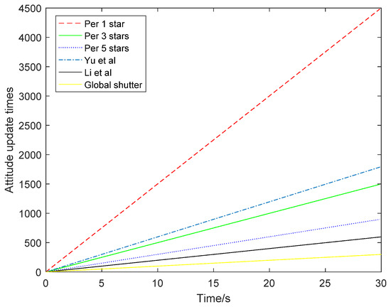 The attitude update times of the three different situations are compared in Figure 13. When the attitude was updated once for each star point, the update times were the highest, reaching 4500 times, and the attitude update rate was 150 Hz. However, the accuracy of its attitude angle was relatively low. When the attitude was updated every five stars, the attitude accuracy was higher but the attitude update rate was only 30 Hz. When the attitude was updated every three stars, the attitude update rate was 50 Hz and the accuracy was between the former two. Therefore, the choice of attitude update rate and accuracy can be determined according to specific actual requirements.