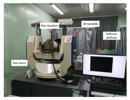 The experiment used the Star1000 star sensor, the static star simulator and the high-precision 2D turntable independently developed by the Institute of Optoelectronics of the Chinese Academy of Sciences. The specific parameters of the Star1000 star sensor are listed in Table 4. The star sensor was installed and fixed in the center of the turntable. The static star simulator was placed in front of the operating table and the star sensor lens was aimed at the static star model. Figure 14 shows the experimental setup. Through rotation of the turntable, the environment of the real star sensor in the orbit was simulated. At the same time, the software platform was used to collect the navigation star point information taken by the star sensor.