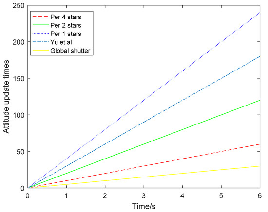In Figure 18, compared with the traditional global exposure, the attitude was updated once per frame of the star map, and the attitude update rate increased by two times, four times and eight times, from the original 5 Hz to 10 Hz, 20 Hz and 40 Hz, respectively. The update times of the attitude update per star point are the same as the update times of the method based on the extended Kalman filter [8], which is 1.3 times higher than the attitude update rate of the method proposed by Yu Wenbo et al. [5]. Compared with the method proposed by Li Xinpeng et al. [6], the attitude update rate is four times higher than that of updating the attitude every single star point. The attitude update rate is twice that of updating the attitude every two stars and the attitude update rate is the same as that of updating attitude every four stars. Moreover, the method proposed in this study can be adapted to the requirements of different scenarios, and the attitude update rate of the star sensor can be selected according to the specific number and distribution of star points.