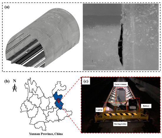 In order to obtain both tunnel lining features (Figure 2a) and depth information of the spalling defects, an integrated MLS system [56,57] was adopted to collect the point cloud data of railway tunnel linings in Yunnan province, China (Figure 2b). The MLS system used in this study comprises a Z+F PROFILER 9012 laser scanner, an electrical motor driven trolley, a laptop, two batteries (24VDC), and other necessary accessories (Figure 2c). The PROFILER 9012 laser scanner operation is controlled by the laptop, powered by the batteries, and supported by the trolley platform.
