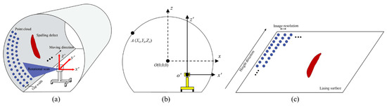 In recent years, photogrammetry has developed rapidly as a non-destructive inspection method for tunnel structure health monitoring [33,34,35,65]. By mounting high-resolution linear charge coupled device (CCD) cameras onto a movable inspection platform, photogrammetry can achieve continuous scanning imaging of the tunnel lining surface along the longitudinal direction. The obtained high-resolution images are used for the detection and quantification of defects on the tunnel lining (water leakage, cracks, and spalling). However, only the 2D evaluation information (segmentation result and area value) of the defects can be obtained. The depth information and 3D spatial coordinates of the spalling defects are hard to calculate. Therefore, it is difficult to obtain the volume of the detected spalling defects.