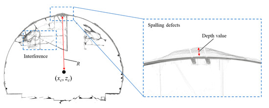 where the depth value D denotes the absolute depth value between the spalling defects to the fitting ellipse lining surface. It is assumed that the transverse section of a deformed circular-tunnel can be considered as an ellipse [61], (x, z) is an arbitrary point from the point cloud data, (xc, zc) is the centre point of the tunnel section, and R denotes the distance between (xc, zc) to the fitting ellipse surface (Figure 4). The interference objects on the surface of tunnel linings with depth values less than 0 are set to 0 and the depth values of the anomaly points are set to 1.