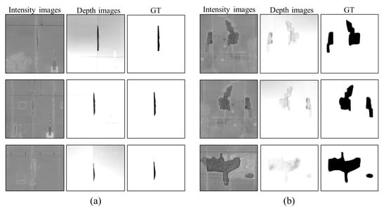 Some examples of the RTSD dataset, including: (a) spalling defects images with a large depth and (b) spalling defects images with a shallow depth.