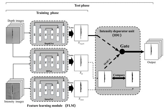 In accordance with the RTSD dataset, a DCNN-based model named SIDNet for automated segmentation and quantification of spalling defects is proposed in this study. It was developed based on the D3Net model [45], which consists of two major components: a feature learning module (FLM) and a depth depurator unit (DDU). The FLM model concludes three encode-decode modules for the semantic feature extraction. The DDU is used to remove the negative influence from low-quality depth images. For most samples in the RTSD dataset, the depth information contains more reliable spalling defects features than the intensity images. Therefore, in the proposed SIDNet, the original DDU in the D3Net model was replaced by a similar function module named the intensity depurator unit (IDU), which can adaptively filter the low-quality (Figure 6a) intensity images. In other words, the proposed SIDNet contains the FLM and the IDU modules. Figure 7 depicts the entire model, which can be divided into the training phase and the test phase. The IDU is only used in the test phase.