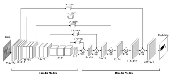 After the six convolution stages, six feature maps are captured with multi-level semantic information. Inspired by the feature pyramid network (FPN) [64], a similar module is designed for a multi-level semantic information extraction in a pyramid manner. For a specific coarse feature map, nearest neighbour operation is employed to achieve 2× up-sampling. To re-use the higher-resolution feature maps for richer information, the up-sampled feature maps are subsequently concatenated with the shallower feature maps using a lateral connection. During the decoder process, multi-scale feature maps (32 × 14 × 14, 32 × 28 × 28, 32 × 56 × 56, 32 × 112 × 112, and 32 × 224 × 224) are generated from the top-down pathway and the lateral connection. As a result, the prediction maps are correspondingly outputted from the end of the subnetworks using a 3 × 3 convolution layer. For the training phase, the widely used cross-entropy loss function is adopted to evaluate the difference between the GT image and the prediction image:
