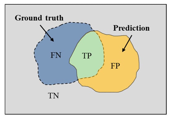 For the semantic segmentation task, mean pixel accuracy (MPA) and mean intersection over union (MIoU) are the common metrics for evaluating the performance of the trained model. To calculate these two pixel-level segmentation metrics, four important parameters are firstly introduced: true negative (TN), true positive (TP), false negative (FN), and false positive (FP). Among these, TP and FP indicate the number of correctly segmented and falsely segmented pixels, and TN and FN denote the correctly unsegmented and falsely unsegmented pixel numbers, respectively. The correlation between TN, TP, FN, and FP is shown in Figure 9. In order to show the relationship between evaluation metrics and these four parameters, the calculation formula is shown as follows: