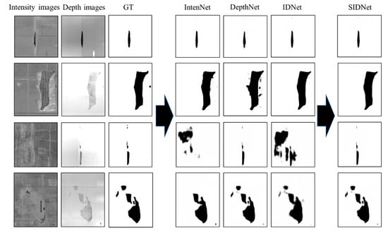 To verify the effectiveness of the IDU module, the performances of three DCNNs (IntenNet, IDNet, and DepthNet) were compared with the performance of the SIDNet and the D3Net. As shown in Table 2, the IDNet (0.970 and 0.911) performed slightly better than the DepthNet (0.957 and 0.905) in MPA and MIoU, and much better than the IntenNet (0.904 and 0.838). The D3Net with the DDU module shows a better performance than the IntenNet but a lower performance than the IDNet and the DepthNet. The relative low performance of the D3Net is caused by filtering the depth feature. Therefore, the depth feature is more reliable than the intensity information in the semantic task of segmenting tunnel spalling defects. Meanwhile, the SIDNet model with the IDU module shows the best performance compared to the three DCNNs. The IDU’s ability to discard the low-quality intensity feature and choose an optimal path (Sid or Sdepth) contributes to its superior performance. The metrics of SIDNet and D3Net also prove the IDU’s superiority to the DDU.