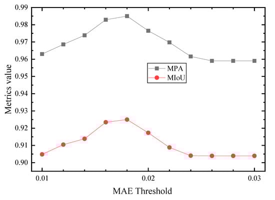 The test dataset contains 809 intensity and depth images. Three output feature maps are generated from the three DCNNs. Subsequently, the optimal prediction will be determined by comparing the similarity (MAE value) of Sinten and Sid with the threshold tinten. With the IDU module, the high-quality intensity features (MAE value greater than tinten) retained (Figure 11, row 1 and 2), and low-quality intensity features (MAE value less than tinten) filtered out (Figure 11, row 3 and 4). The value of tinten thus affects the selection of the final output image. A set of tinten values (11 uniformly distributed values between 0.01 and 0.03) are further tested in this paper, and the model performance of each threshold is evaluated. Figure 12 shows that when tinten is 0.018, both the MPA and MIoU values of the model reach a maximum (0.985 and 0.925), which indicates that the model achieves the best performance.