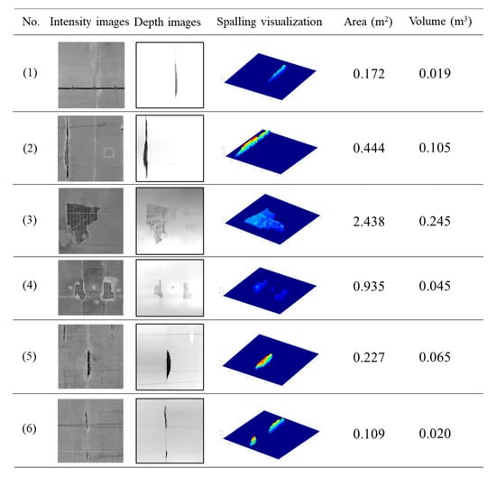As mentioned in Section 3.4, the spalling quantification information (area and volume) can be obtained by counting the predicted pixels and summing the actual depth values belonging to the spalling region. Using six test samples as an example, Figure 14 shows the detection and the statistical quantification results of the detected defects. The input images (intensity and depth images) are presented, and the spatial shape of the spalling defect is plotted using a colour distinction (blue to red) to represent the actual depth value (0 to 0.5 m). The computed area and the volume value are also given.
