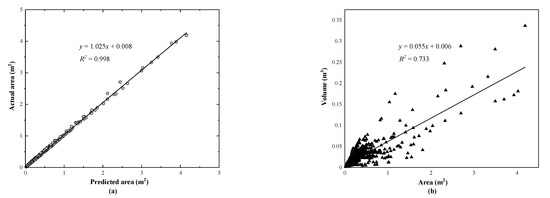 Comparison evaluation of the prediction indexes, including: (a) predicted and actual areas of the spalling defects and (b) predicted area and predicted volume.