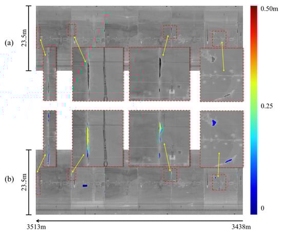 The comparison from a 75 m long tunnel section between (a) the stitched input intensity image and the enlarged local regions and (b) the inspection results output from the SIDNet model and the enlarged spalling defects regions (the depth value ranges from 0 (blue) to 0.5 m (red)).