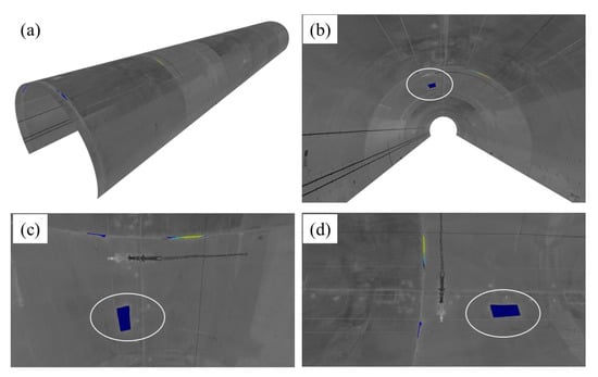 A 3D model of the 75 m tunnel region was constructed based on the predicted image which shows different viewing perspectives of the tunnel lining (Figure 19). The 3D model also provides an intuitive 3D view of the location and distribution of the detected spalling defects. By using depth images, the depth of spalling can be visualized in the form of different colour distinctions. If needed, the interference objects can be also eliminated in the reconstructed 3D model. A spalling inspection report can also be automatically generated (Table 3). In this report, the longitudinal location (the mileage according to the tunnel entrance that can be seen in the Figure 18), the according angle range of each spalling defect (the start and end angle relative to the x axis, which has been introduced in Huang et al. [55]), the area, and the volume of the identified spalling defect are accurately quantified and outputted. This automated spalling inspection approach can significantly aid with tunnel structural health monitoring and improve the digital management of railway tunnels.