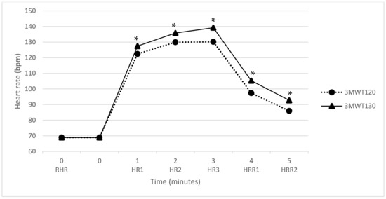 The mean HR responses to the 3MWT120 and the 3MWT130 can be observed in Figure 1. The mean HR was 69 bpm at rest, reached 130 bpm and 139 bpm during exercise and dropped to 86 bpm and 93 bpm after two minutes of recovery for the 3MWT120 and the 3MWT130, respectively.