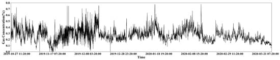 Specifically, we note that if there were no readings within any one 10 min in the original sequence, then it would be represented as a null value of the corresponding position in the new normalized sequence. The statistical analysis of the original gas concentration data in coal mines shows that in the collected gas concentration data, the missing rate of a large number of monitoring points exceeds 20% during the period of 2019.10.22 00:00:00~2020.03.24 00:00:00, which might greatly affect the downstream modeling and analysis. Therefore, we only selected gas concentration data from six monitoring points with a missing rate of less than 20% in this study. These six monitoring points are respectively the return air gas face on surface 8301, the working face gas on surface 8301, the top corner gas on surface 8301, the top corner gas on surface 8222, the return air gas face on surface 8222, and the working face gas on surface 8222 (we call them D1, D2, D3, D4, D5 and D6 in brief). Figure 1 shows the variation trend of gas concentration in data set D1, and the variation trend of gas concentration in data sets D2–D6 are shown in Figure A1, Figure A2, Figure A3, Figure A4 and Figure A5, respectively. The statistical results of these data sets are shown in Table 1.