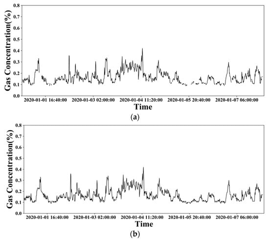 Figure 2a,b show the variation trend of gas concentration before and after imputing the missing data within a week. From Figure 2b, we can see that the gas concentration variation trend is more continuous and regular after data imputation, which verifies its rationality.