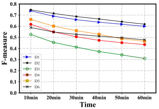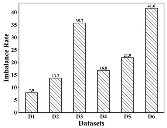 In this study, we designate 0.40 as the threshold and in actual production the early warning threshold may be much higher than 0.40. Specifically, for each future 10 min, it corresponds a prediction, hence the data set can be further divided into six different subsets. We provide the statistics about the class imbalance rate (the number of instances belonging to the majority class divided by that of the minority class) on the data sets D1–D6 (see Figure 4). From Figure 4, it can be seen that although the data sets hold different class imbalance rates, the imbalance distribution is obvious, which might bring challenges for further modeling the classifier.