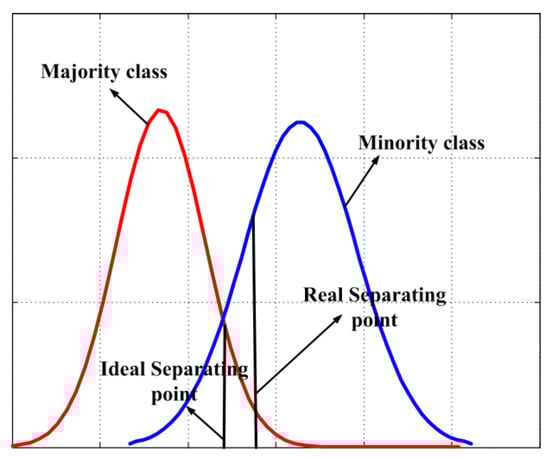 Without loss of generality, we suppose the classification task is binary. Let be the training data set, where and denote the minority and majority class, respectively. Then Φ can be divided into two different groups and , where and meanwhile . To further simplify the procedure of analysis, we suppose the number of attributes m = 1, and in this attribute, both classes satisfy the Gaussian distribution (see Figure 5). Then the prior probability , and the conditional probability , can be directly acquired. According to Bayesian formula, the posterior probability of two classes can be calculated as follows: