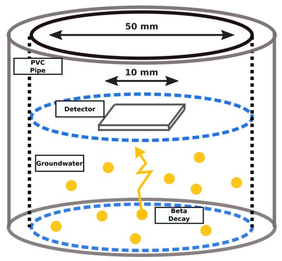 The scenario simulated in the simulation. A PVC pipe, with a 5 cm diameter, comprises the innermost layer of the borehole and it is surrounded by silicon. The detector is deployed in contact with the water, which is populated randomly with decaying radionuclides.