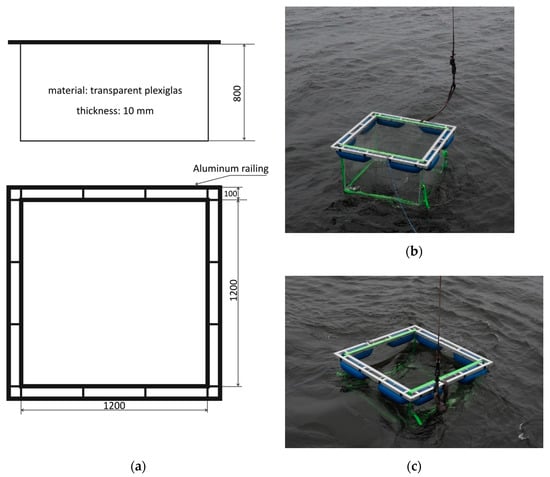The oil-polluted area was limited to the dimensions of a transparent floating tank of 1.2 m × 1.2 m × 0.8 m, containing 1.152 m3 of water in the full immersion. Figure 1 shows the scheme of the tank and its implementation, first placed on the sea surface and then floating during the natural immersion.