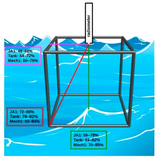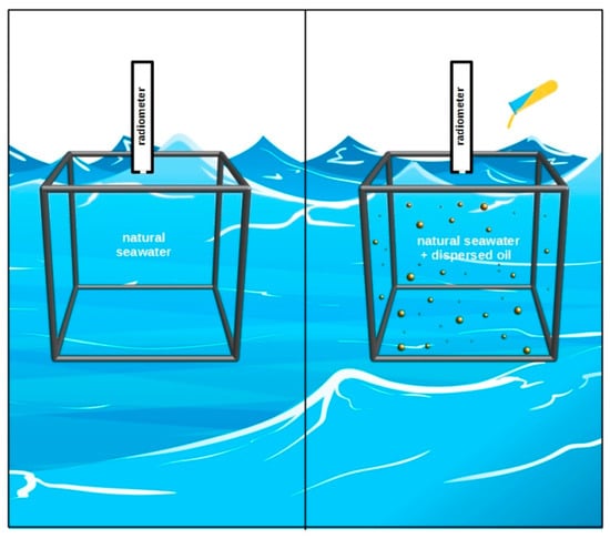 For the measurements, the tank was transported from the ship deck onto seawater. It was allowed to float awhile until it reached a position not affected by ship shadow. The scheme of the experiment concept is presented in Figure 2. Radiometric measurements were first carried out in the tank filled with natural seawater. Then, the tank was supplied with five consecutive portions of dispersed oil, and radiometric data were collected after each supplementation.