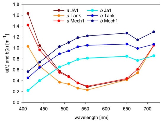 Spectra of absorption a(λ) and scattering b(λ) coefficients of the surface water layer of 0–1 m collected during the field campaign in April 2016 by AC-9 sensor at three stations: JA1 (13 April 2016), Tank (16 April 2016), and Mech1 (17 April 2016).