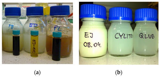Samples of mechanically dispersed oils: (a) Petrobaltic PB, biodiesel BD, Flotta FL (small bottles contains pure oils, large bottles—concentrated oil dispersions); (b) Evinrude Johnson EJ, Cyliten CL, Quicksilver Lube QL.
