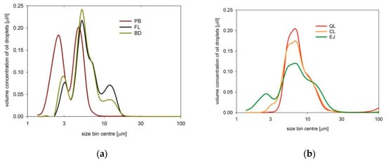 All oil dispersions consisted mostly of micrometer-sized droplets and reached main maxima between 5 and 7 µm. Dispersed BD, EJ, PB, and FL also contained smaller oil particles which contribute very significantly to the backscatter signal [,]. Dispersed EJ, QL, and CL (as well as FL and BD in a minor degree) also contained large oil droplets of tens of micrometers. Such droplets tend to absorb more light than small droplets.