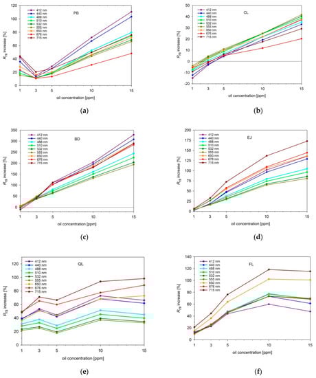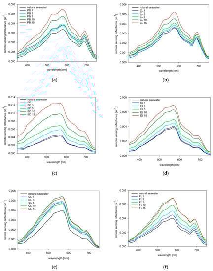 Figure 9 displays spectral characteristics and the degree of changes of Rrs caused by addition of five consecutive portions of dispersed oil droplets. PB and BD oil droplets (see Figure 9a,c) affected mostly the short (blue) visible waves of the upwelling light; CL droplets (see Figure 9b) most significantly increased the central (green) visible bands, while droplets of EJ, QL, and FL (see Figure 9d–f) resulted in the highest Rrs increase at long (red) visible bands.