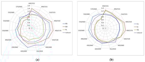 Polar plots of the impact of dispersed oils in the concentration of 15 ppm on selected Rrs band ratios: (a) Petrobaltic (PB), biodiesel B-100 (BD) and Flotta (FL); (b) Cyliten N460 (CL), Evinrude Johnson (EJ) and Quicksilver Lubricant (QL). The scale shows values relative to the corresponding natural seawater band ratios.