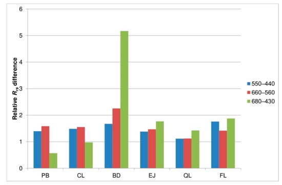 A further five ratios in Figure 10 represent blue-to-red Rrs band ratios which do not have any standard global application in bio-optical algorithms in the ocean, however they are used locally in coastal waters, e.g., to derive surface concentrations of suspended particulate matter (SPM) and particulate organic carbon (POC) [,]. We found that there are Rrs band ratios affected by all or most types of investigated oils. As an example, the ratio of Rrs(490)/Rrs(690) increased by 19.5% after addition of 15 ppm of PB, and decreased by 9–22% for BD, EJ, and QL. Similarly, the ratio of Rrs(420)/Rrs(690) was increased by 8–39% by some oils (CL, BD, PB) and decreased by others by 5–12% (EJ, FL, QL). Some particular Rrs band ratios demonstrated the maximal influence for each type of oil droplets. Specifically, light crude PB oil droplets increased the ratio of Rrs(400)/Rrs(680) from 6% to almost 50% depending on droplet concentration. The maximal change caused by FL oil droplets was a 36% decrease observed for the ratio of Rrs(412)/Rrs(650).
