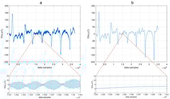 Total-field anomaly acquired using different flight configurations. (a) Data acquired with a magnetometer–UAV distance of 0.5 m (F0.5 dataset); (b) data acquired with a magnetometer–UAV distance of 3 m (F3.0 dataset). “TFA” stands for “total-field anomaly.”
