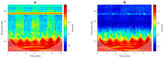 Spectral analysis of UAV data. (a) Scalogram of F0.5 dataset; (b) scalogram of F3.0 dataset. Edge effects in the computation of the spectra may be significant in the dimmed area below the dashed white line.