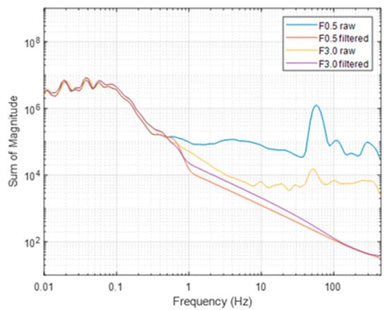 For frequencies above 0.5 Hz, the F0.5 signal always has a higher magnitude than that of F3.0, with an evident peak around 50 Hz. This feature, highlighted by the scalogram analysis, can be interpreted by the presence of a significant platform-induced magnetic and electromagnetic interference sensed by the magnetometer. Ref. [15] shows that most of the electromagnetic interference caused by the drone engines has a main power spectral density peak at about 50 Hz. The data acquired with the F3.0 configuration was clearly less affected by magnetic interference from the UAV. However, the scalogram shows again a peak in the power spectral density around 50 Hz and, with much lesser amplitude, at 10, 20, and 30 Hz. To compare easily the two datasets for each flight, we computed the sum of the scalogram magnitudes at each frequency (Figure 5). It resulted that the scalograms of the two datasets were very similar for frequencies lower than 0.5 Hz.