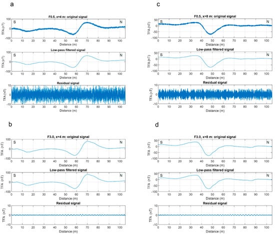 Application of a 0.5 Hz Hanning-window low-pass filter along two profiles for F0.5 and F3.0 datasets. The three plots in each panel show the raw data, the filtered data, and their difference (the residual signal). (a) Profile at x = 4 m; the magnetometer–UAV distance was 0.5 m; (b) profile at x = 4 m; the magnetometer–UAV distance was 3 m; (c) profile at x = 8 m; the magnetometer–UAV distance was 0.5 m; (d) profile at x = 8 m; the magnetometer–UAV distance was 3 m. The difference in amplitude between the residual signal in (a,c) demonstrates the heading error, as the two profiles were acquired while flying in opposite directions. “TFA” stands for “total-field anomaly.”