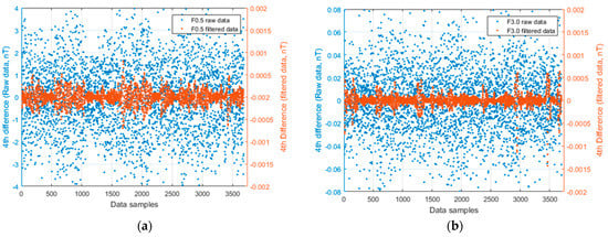 where ΔT−2, ΔT−1, ΔT+1, and ΔT+2 are the four values measured at locations symmetric with respect to the central value. Generally, the accepted level for the noise envelope, as evaluated by the fourth difference, should be less than ±0.05 nT for data sampled at 10 Hz [19]. The F0.5 and F3.0 datasets were resampled at 10 Hz, and the fourth difference was evaluated (Figure 7). The unfiltered F0.5 data shows a strong noise, with an FDIFF ranging from −4 nT to 4 nT. However, after the filtering, the fourth difference values were well inside the ± 0.05 nT range. In the case of the F3.0 dataset, the unfiltered data were practically already inside the ± 0.05 nT range.