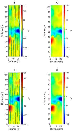 As a standard processing step, we interpolated the data recorded along the seven profiles for the two drone-borne datasets to have a map of the magnetic anomalies in the area, using a gridding cell of 1 × 1 m2. The position, amplitude, and shape of the anomalies shown in the maps of the raw (Figure 8a,b) and filtered data (Figure 8c,d) were similar. The two total field maps showed a maximum amplitude variation of about 280 nT, ranging from about −150 to 130 nT, and we identified two main groups of anomalies, one trending NE–SW and located in the central sector, displaying the greatest amplitudes, and the other in the northern sector approximately trending in an E–W direction. Small amplitude differences between the two maps can be attributed to the different noise levels, to the inaccuracy of the flight altitude, which was set by GPS and which may have slightly differed between the two surveys, and to the inaccuracy of the GPS horizontal positioning in areas with strong magnetic gradients.