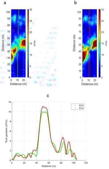 Total gradient maps relative to filtered F0.5 (a) and F3.0 (a) UAV datasets; (c) total gradient computed along a filtered profile (located by green and red lines in (a,b)). The green line refers to the F0.5 dataset, and the red line refers to the F3.0 dataset.