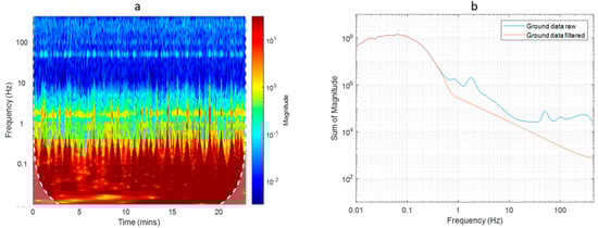 As the power of the target signal was concentrated at frequencies similar than in the UAV case, to remove the power related to the noise and preserve the useful signal at lower frequencies, we applied to the ground data along each profile the same low-pass filter designed for the UAV data (cut-off frequency of 0.5 Hz, using a Hanning window). The result of the filtering and the comparison with the original data is presented in Figure 10b as the sum of power of the scalogram for each frequency.