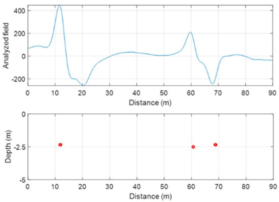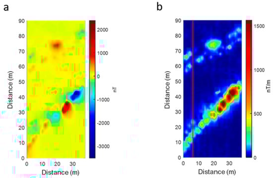 Based on previous information and on the magnetic anomalies’ shapes, we can infer that the sources of the anomalies were probably buried pipes and, perhaps, cables. In fact, the magnetic anomalies display the typical alternating magnetic highs and lows that can be measured above a metal pipe [20]. The individual sections of metal pipes acquire a permanent magnetization during manufacture, forming single magnetic dipoles. The direction of the magnetization varies from one pipe section to another depending on the orientation of the pipe, and this reflects in the systematic variation of the anomaly amplitudes, and/or sign, above a pipeline [20].