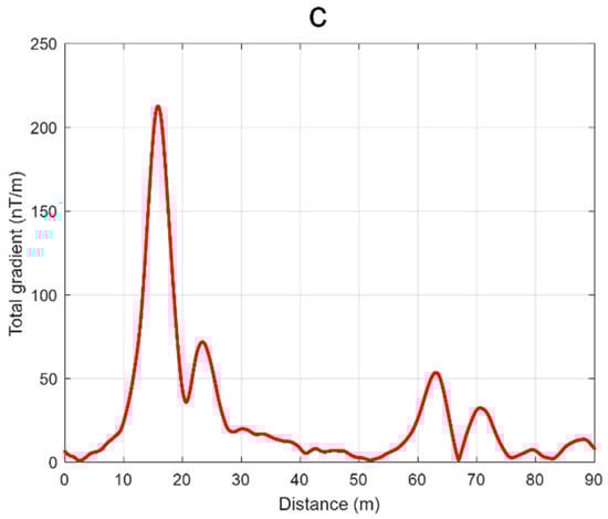 To better locate the buried sources of the magnetic anomalies in the area, we computed the total gradient, also known as the amplitude of the analytic signal [21]. In the total gradient maps (Figure 9), the anomaly sources should be located in correspondence to the maxima, except for possible small offsets that theoretically should not be present when computing the total gradient due to 2D sources along a data profile. The maps of Figure 9 clearly show the source position in the central sector, while in the northern zone the number and location of the sources appears more uncertain. The analysis of the total gradient computed along the data profiles (Figure 9c) can help to better distinguish all the sources present, because of the very high spatial detail (the sampling step is only 2 mm). From the analysis of all the data profiles the probable presence of linear anomalies elongated in the NE–SW direction can be recognized, with two of them in the northern area (80 m < y < 95 m) and one in the central area (20 m < y < 60 m). The intense anomaly in the central area may also be the result of the coalescence of the magnetic effects of two nearby linear structures.
