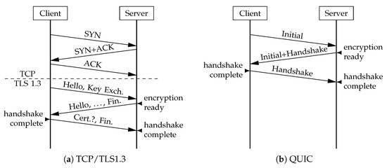 Establishment of TCP (a) and QUIC (b) with version 1.3 TLS.