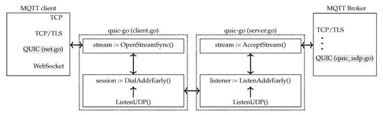 The MQTT client and the server broker are based on open-source Eclipse Paho (https://github.com/eclipse/paho.mqtt.golang (accessed on 10 April 2020), version v1.2.0.) and VolantMQ (https://github.com/VolantMQ/volantmq (accessed on 10 April 2020), version v0.4.0-rc6.), respectively. Both of them are implemented in GO and support MQTT 3.1 and 3.1.1. Eclipse Paho builds a library that enables applications to connect to VolantMQ broker using TCP, TLS or WebSocket. Both projects are based on GO 14.0 version, and they are open-source, which allowed us to tweak them to use QUIC, which was also developed with the same GO version. Figure 3 illustrates the changes that were made over the legacy implementations of both net.go and quic_udp.go.