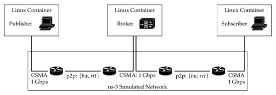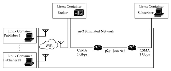 Experiments were performed using the discrete-event network simulator for internet systems ns-3 (https://www.nsnam.org/ (accessed on 10 April 2020), version 3.24). It provides the possibility to use virtualization techniques to connect traffic from real applications by running LXC Linux containers (LXC version 3.0.3, Ubuntu 14.04 images) over a simulated network. We have deployed an emulated platform, based on the scenario depicted in Figure 4, which hereinafter will be referred to as Scenario A. It entails three Linux containers, which are connected through ns-3. Each network emulates various wireless technologies, considering two parameters: bandwidth and delay. End containers run the client applications, publisher and subscriber, while the middle container runs the broker server.