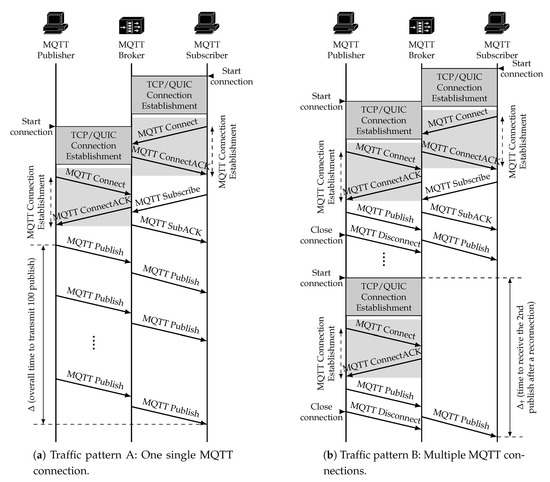 - Fernández, F.; Zverev, M.; Garrido, P.; Juárez, J.R.; Bilbao, J.; Agüero, R. Additionally, QUIC meets IoT: Performance assessment of MQTT over QUIC. In Proceedings of the 2020 16th International Conference on Wireless and Mobile Computing, Networking and Communications (WiMob), Thessaloniki, Greece, 12–14 October 2020; pp. 1–6. [Google Scholar] [CrossRef]
