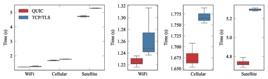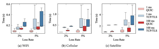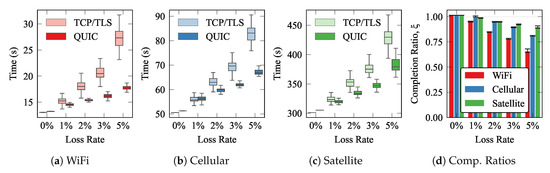 Figure 7 depicts the whisker plots of the completion times, and the completion ratios for each technology. Each whisker shows the median (0.5-percentile), as a horizontal line within the boxes, and the 0.25 and 0.75 percentiles (lower and upper box limits, respectively). Last, the upper and lower whiskers correspond to the 1.5 IQR. The results yield that QUIC had far better performance than TCP, especially over networks with low RTTs (WiFi) and with high loss rates. When there was not any loss in the underlying networks (loss rate 0%), we can see that the performance of QUIC was slightly worse than that exhibited by TCP. This is because QUIC was designed to outperform TCP when the conditions of the network are not ideal. For that purpose, QUIC promotes a more complex and advanced flow management scheme, which requires adding some extra overhead. Hence, when the conditions are ideal, the overall delay is higher. Additionally, we can see that when the RTT was higher, the gain that QUIC created was less noticeable, especially for satellite links. In any case, the results evince that QUIC clearly outperforms the traditional approach, not only in terms of the average delay, but also by exhibiting far less variability, which is also a relevant advantage, since large jitters could hinder the behavior of real-time services.